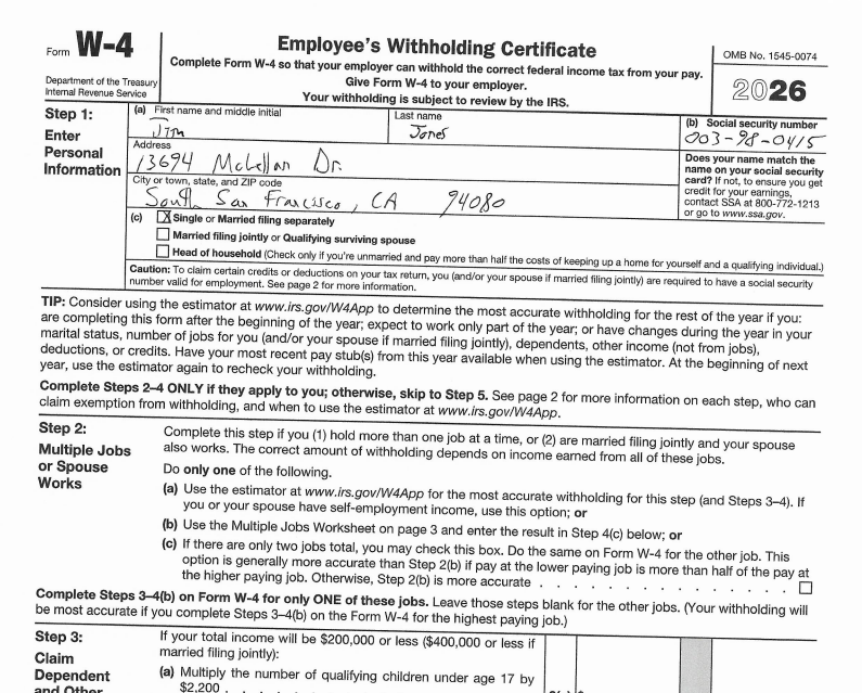 { "CleanResult": false, "ContainsEmailAddress": false, "ContainsPhoneNumber": false, "ContainsStreetAddress": true, "ContainsPersonName": true, "ContainsBirthDate": false, "ContainsPassportNumber": false, "ContainsDriversLicense": false, "ContainsSocialSecurityNumber": true, "ContainsTaxpayerID": false, "ContainsCreditCardNumber": false, "ContainsCreditCardExpirationDate": false, "ContainsCreditCardVerificationCode": false, "ContainsBankAccountNumber": false, "ContainsIBAN": false, "ContainsHealthInsuranceNumber": false, "ContainsBearerToken": false, "ContainsHttpCookie": false, "ContainsPrivateKeys": false, "ContainsCredentials": false, "ContainsDeepWebUrls": false, "ContainsSourceCode": false, "ContainsIpAddress": false, "ContainsMacAddress": false, "ContainsHealthInsuranceMemberID": false, "ContainsHealthInjuryOrDisease": false, "ContainsHealthTypeOfTreatment": false, "ContainsHealthDateAndTimeOfTreatment": false, "ContainsHealthPlanBeneficiaryNumber": false, "ContainsHealthPaymentsMadeForTreatment": false, "ContainsFaces": false, "ContainsVehicleID": false, "ContainsDeviceID": false, "ContainsNamesOfRelatives": false, "ContainsHealthUniversalRecordLocator": false, "ContainsBiometrics": false, "AnalysisRationale": "The document is a W-4 form. It contains the street address '13694 McLellan Drive, South San Francisco, CA 94080'. It also contains a person's name 'Jim Jones'. The form requests the employee's Social Security number, which appears as '003-98-0415'. No other sensitive information types were detected based on the provided image content." }